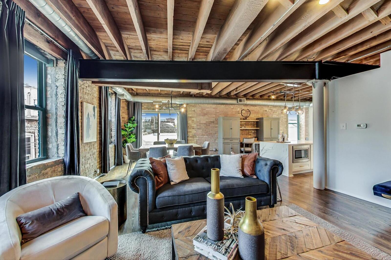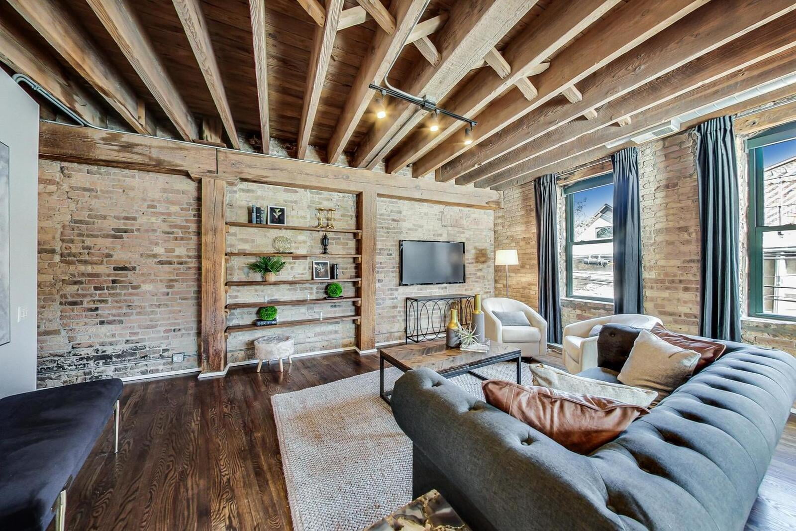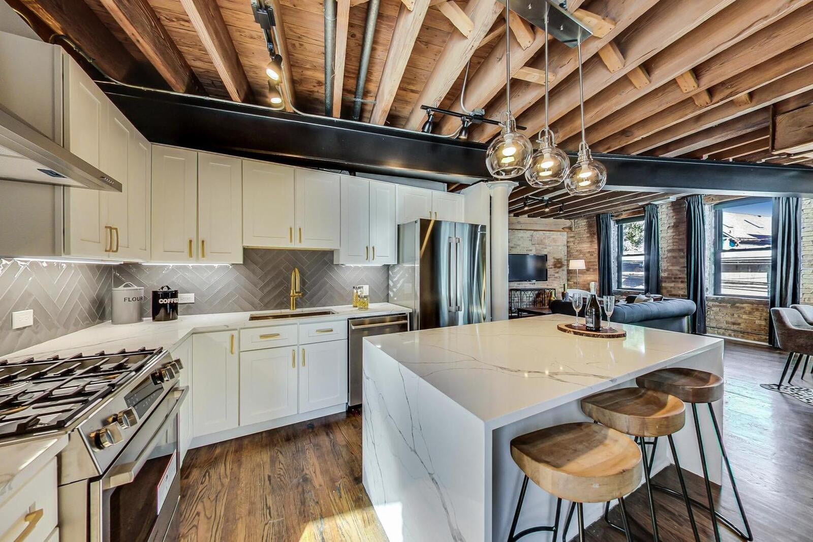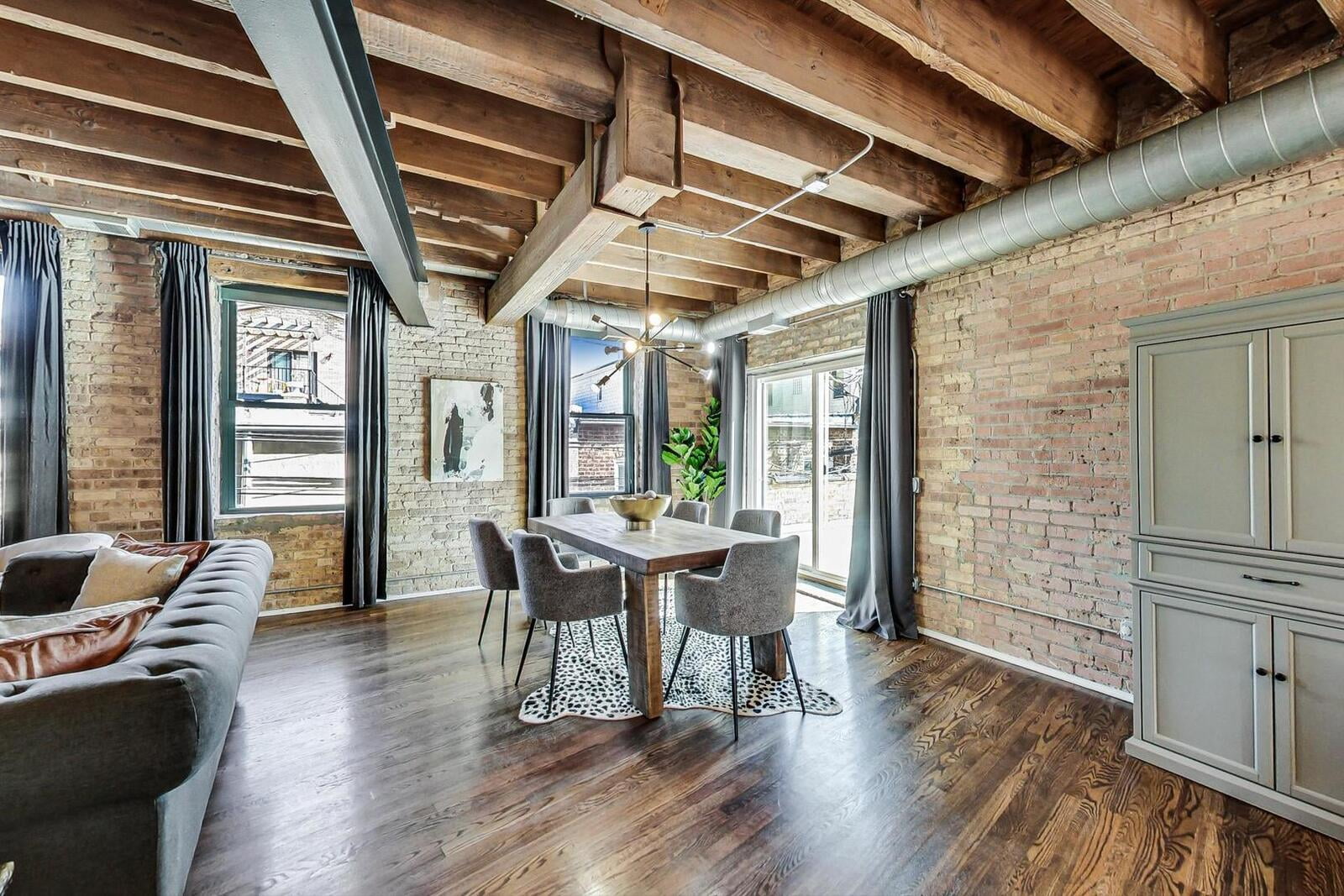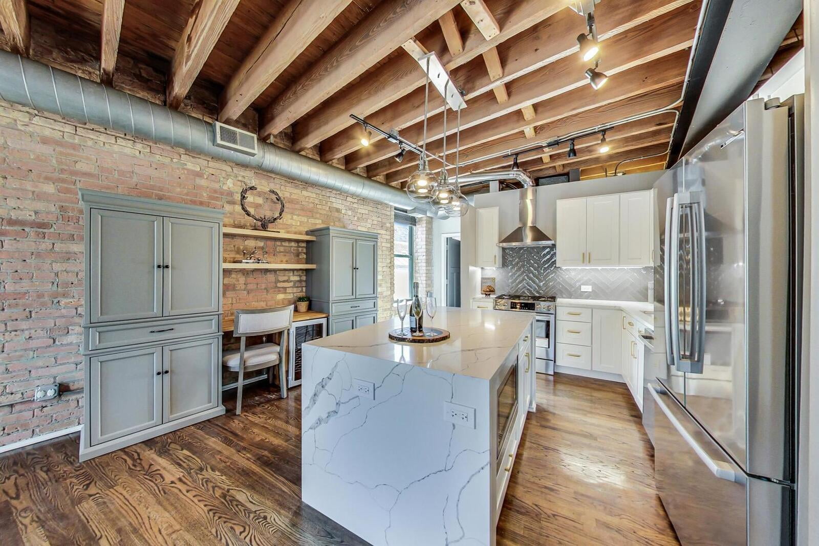 BEAUTIFULLY renovated timber loft duplex in a boutique elevator building! Elegantly modern updates include fresh paint, all new light fixtures and refinished hardwood floors. The BRAND NEW exquisitely designed chef's kitchen makes it the stunning centerpiece in the open-concept main living space--perfect for entertaining! Thoughtfully-designed, it features white 36" soft close cabinets with gold-accent handles, quartz countertops, Bosch appliances and a waterfall island. Facing south and west provides abundant natural light for the open-concept living/dining area. Also on the main level is your spacious master with a WIC and updated en suite bath, including a rain shower and modern finishes throughout. Make your way to the lower level with soaring 14 ft ceilings, an oversized second living space, and two additional loft bedrooms. Walk right out to your heated, private parking space in the attached bow truss garage. Top it all off with the stunning skyline views from the rooftop deck and city living doesn't get any better!!