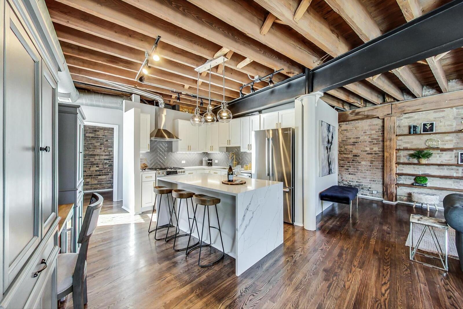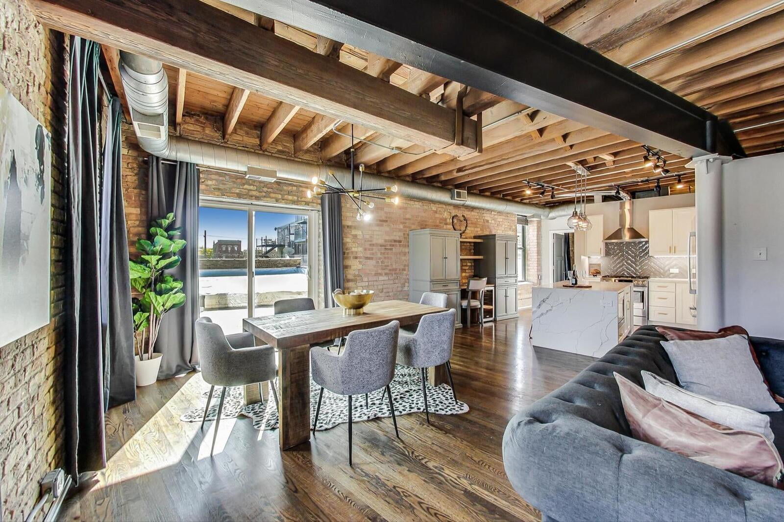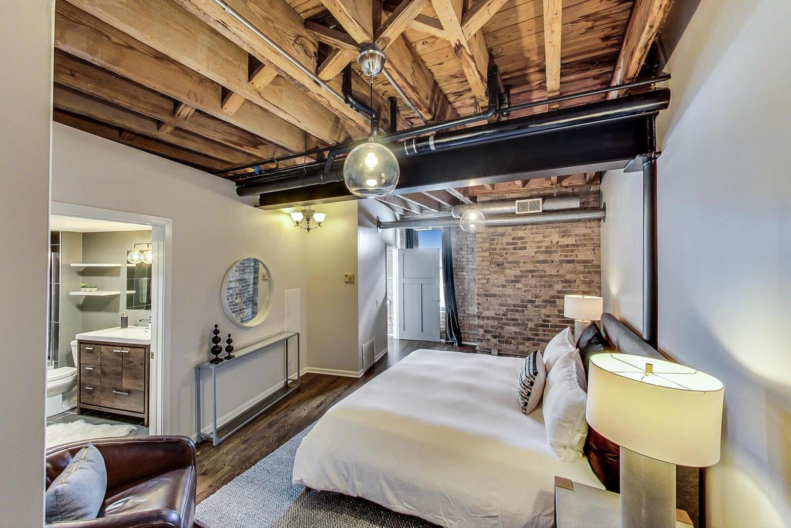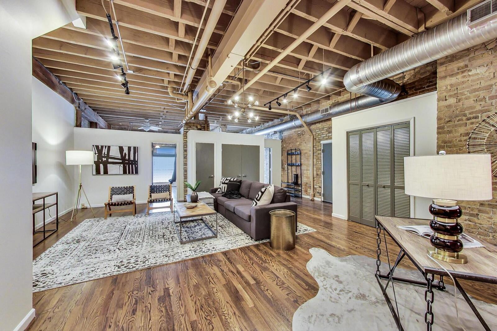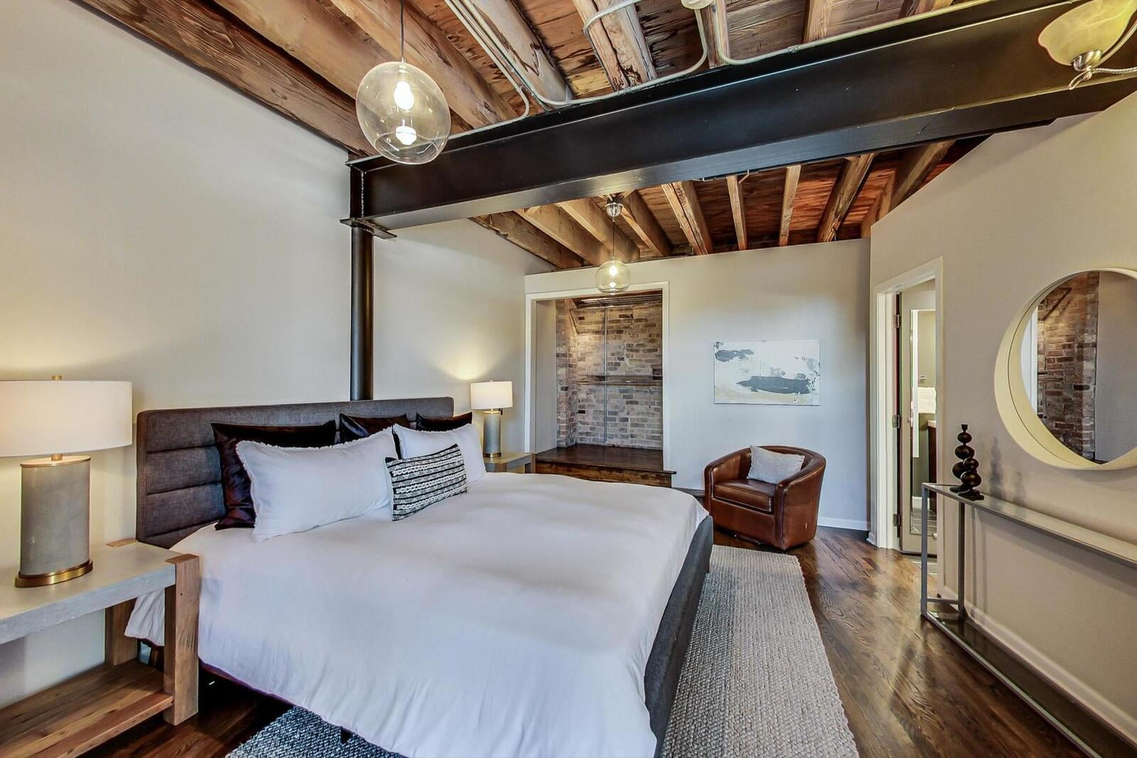 BEAUTIFULLY renovated timber loft duplex in a boutique elevator building! Elegantly modern updates include fresh paint, all new light fixtures and refinished hardwood floors. The BRAND NEW exquisitely designed chef's kitchen makes it the stunning centerpiece in the open-concept main living space--perfect for entertaining! Thoughtfully-designed, it features white 36" soft close cabinets with gold-accent handles, quartz countertops, Bosch appliances and a waterfall island. Facing south and west provides abundant natural light for the open-concept living/dining area. Also on the main level is your spacious master with a WIC and updated en suite bath, including a rain shower and modern finishes throughout. Make your way to the lower level with soaring 14 ft ceilings, an oversized second living space, and two additional loft bedrooms. Walk right out to your heated, private parking space in the attached bow truss garage. Top it all off with the stunning skyline views from the rooftop deck and city living doesn't get any better!!